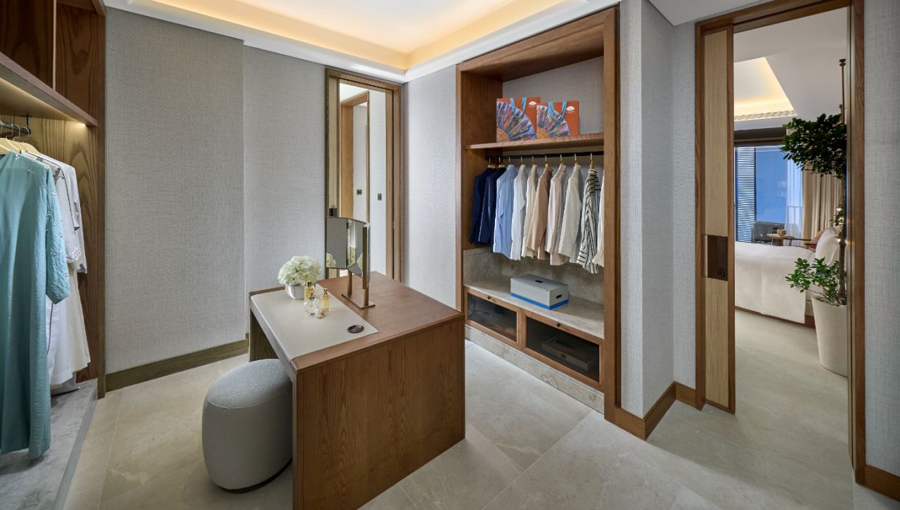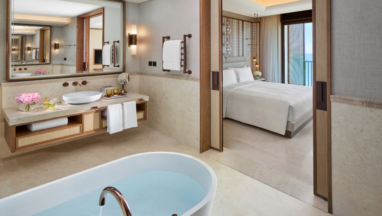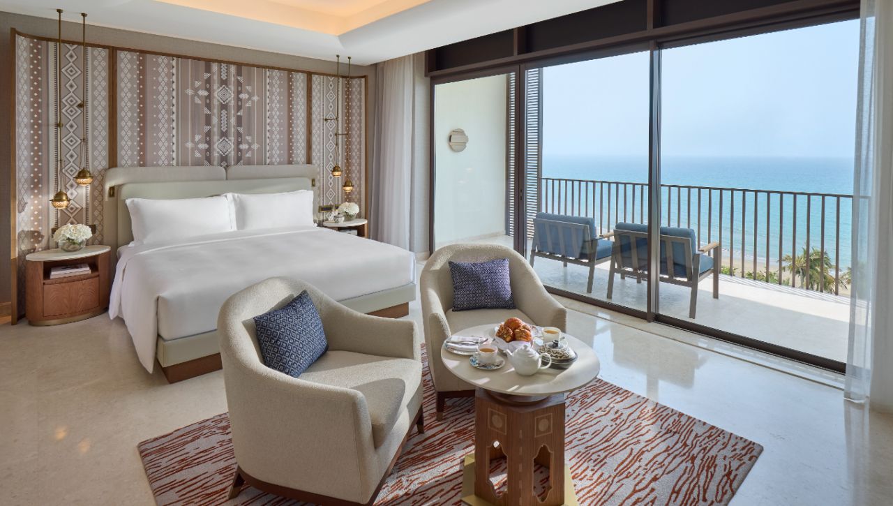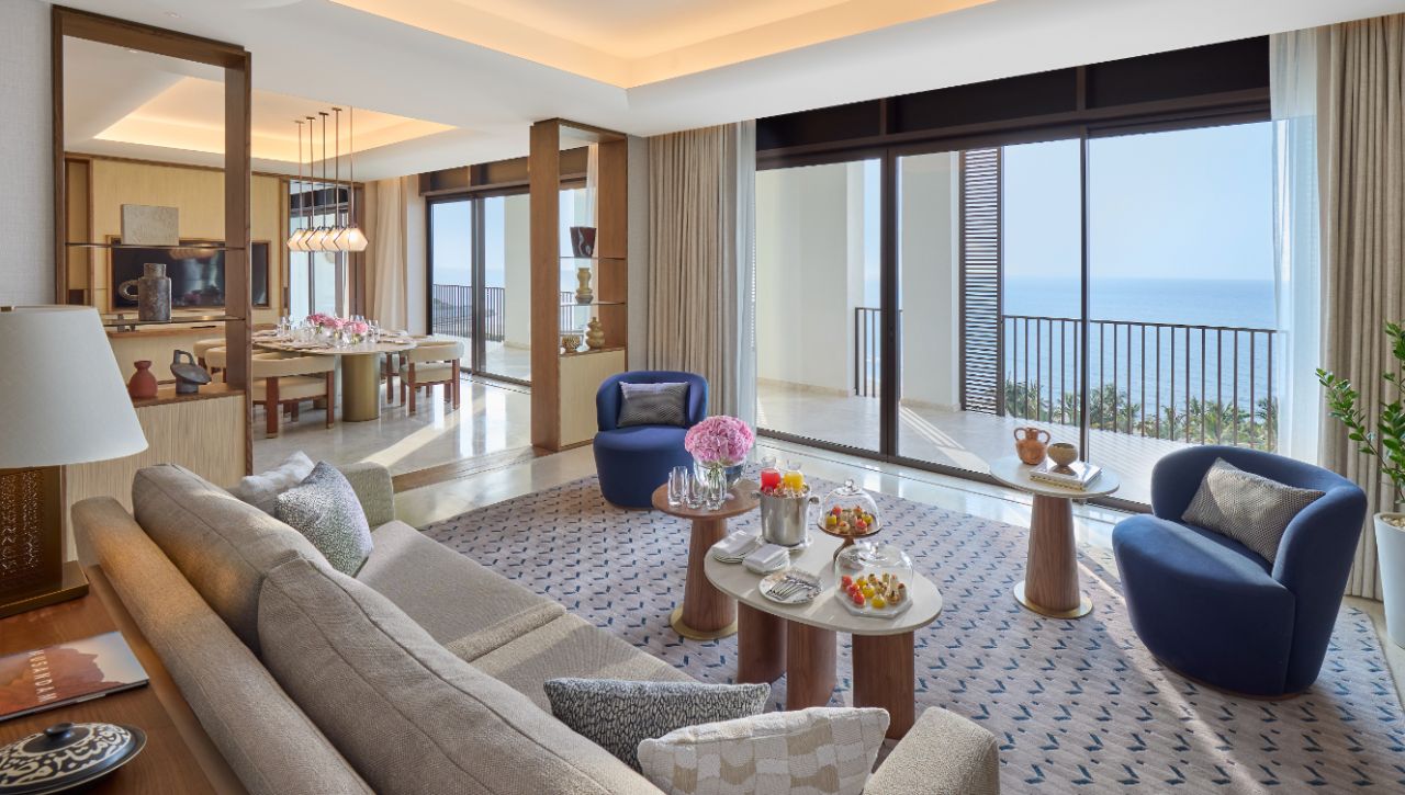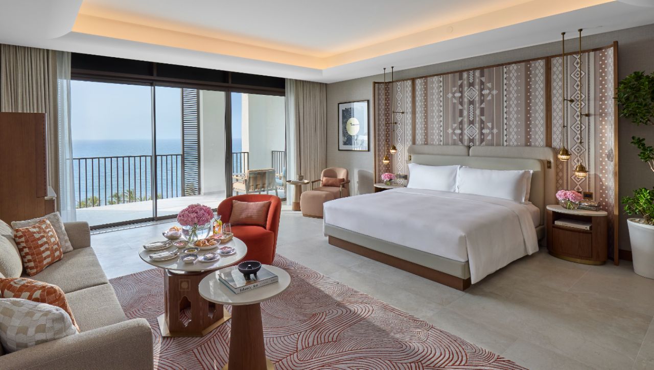Pokoje, suity a rezidence nabízejí výjimečně velkorysé prostory a interiéry navržené s důrazem na světlo, rovnováhu a jemnost materiálů. Design kombinuje přírodní tóny, dřevo, kámen a detaily inspirované arabskou kulturou, zatímco velká panoramatická okna otevírají nádherné výhledy na Ománský záliv nebo na dramatické siluety hor Al Hajar. Každý pokoj je koncipován tak, aby hostům poskytl pocit klidu a soukromé galerie moderní elegance, od prostorných koupelen s mramorovými detaily až po komfortní lounge zóny a rozsáhlé terasy ve vyšších kategoriích. Suity a rezidence dodávají pobytu exkluzivitu v podobě privátních teras, oddělených obývacích pokojů a personalizovaných služeb.